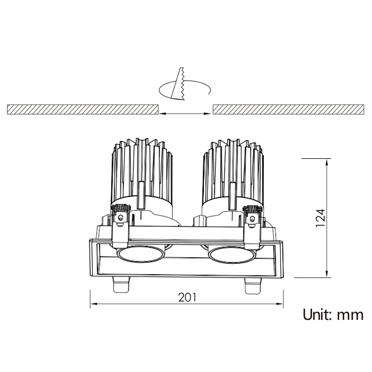 2*25W,Cutout L190×W95mm,Beam15°| 24°|38°|45°|60°,Horizontal 355° + Vertical 30°,IP65,Honeycomb louver Optional,Twin-head Adjustable LED Downlight