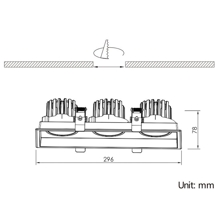 3*10W,Cutout L285×W95mm,Beam15°| 24°|38°|45°|60°,Horizontal 355° + Vertical 30°,IP65,Honeycomb louver Optional,Twin-head Adjustable LED Downlight