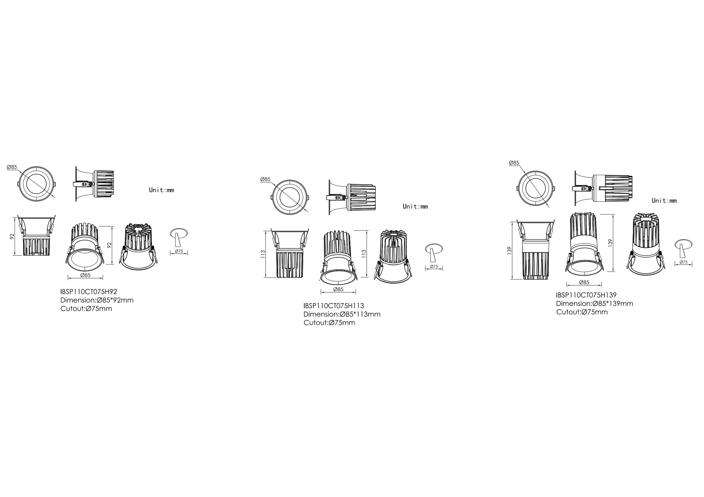 IBSP110CT075H13925WØ85mm×H139mmØ75mmReflector 15°| 24°|38°|45°|60°(Fixed)