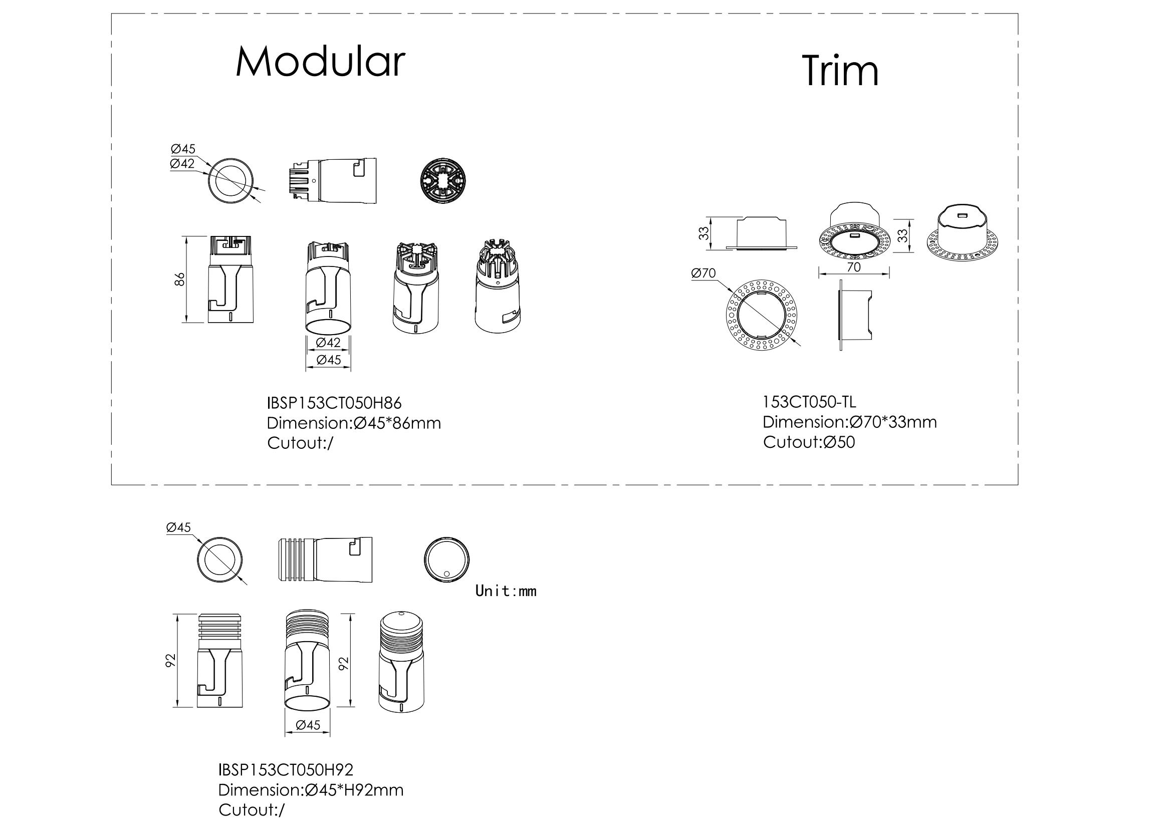 | 153CT050-TL (Trimless Frame) | 丨 | Ø70*H35mm | Ø50mm | Trimless frame for IBSP153 |
